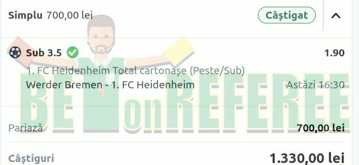 | February 10 | Werder Bremen v FC Heidenheim | U 3.5 YC HEIDENHEIM | 700 | 1.9 | Won | 630.0 |