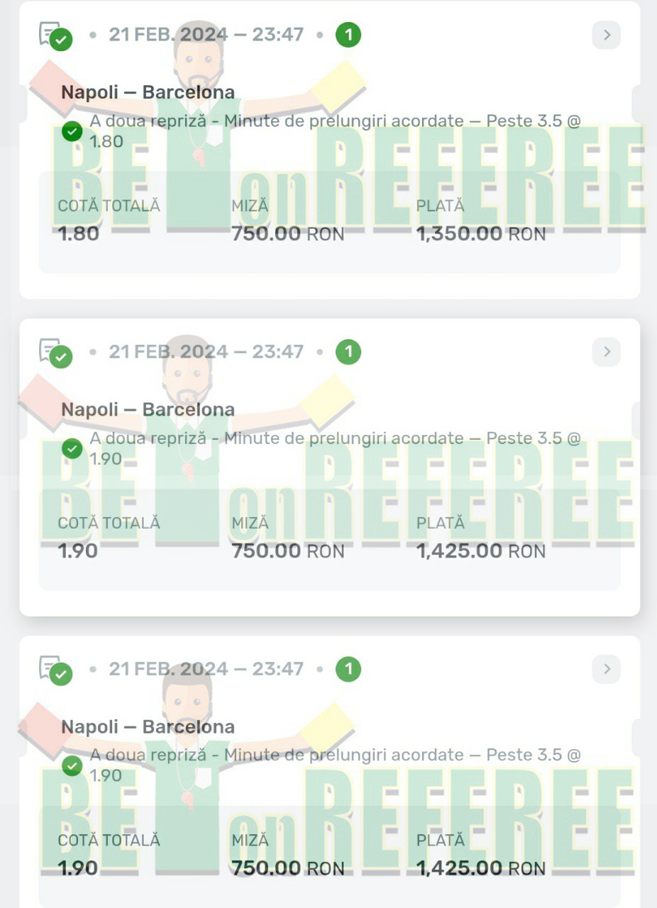 | February 21 | Napoli v Barcelona | O 3.5 min prel | 800 | 1.95 | Won | 760.0 |