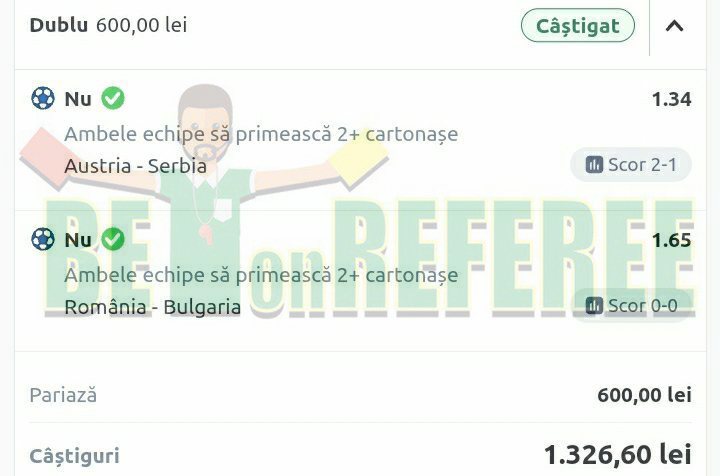 | June 22 | Georgia v Czech Republic | O 12.5 fouls 1st half | 600 | 1.9 | Won | 540.0 |