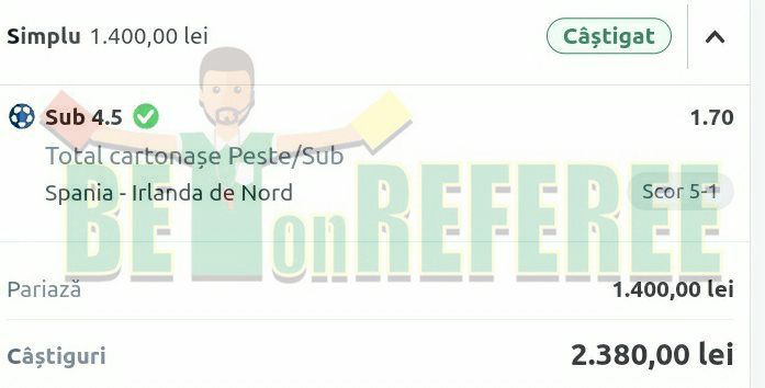 | June 22 | Belgium v Romania | U 20.5 fouls | 1000 | 2.8 | Won | 1800.0 |